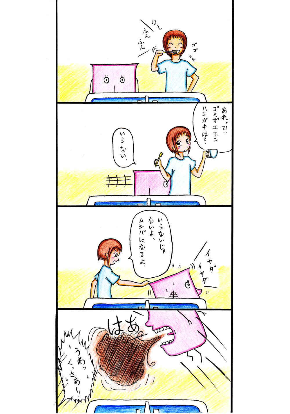 ゴミザエモン君がいかにハミガキを怠けていたのかをひみこちゃんは思い知らされたみたいです。しかし子供には無理に押しつけてもなかなかうまくいかないものです。