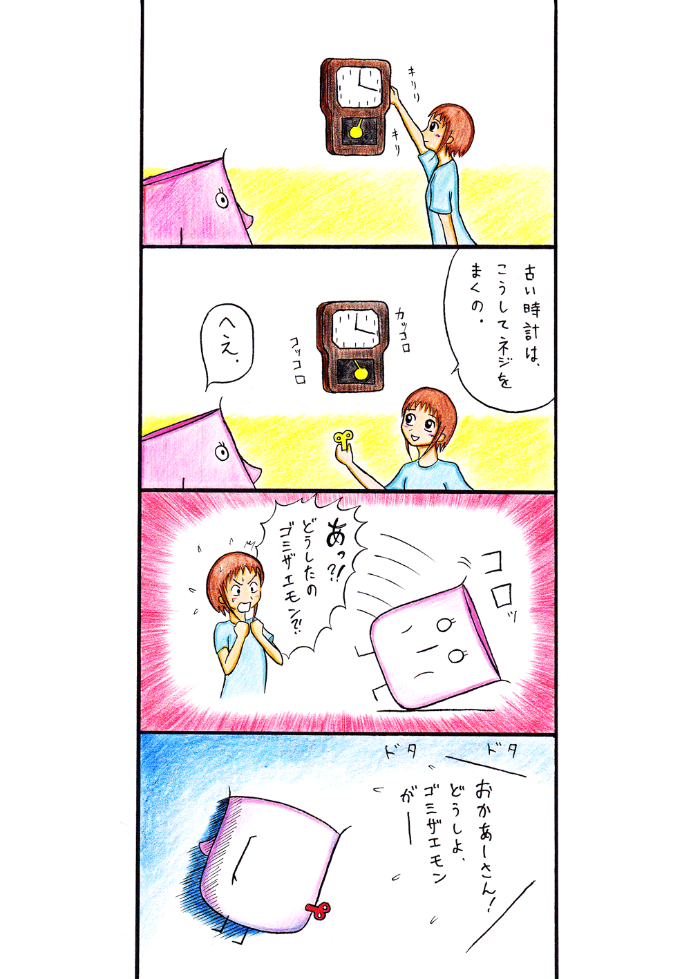 ゴミザエモン君の意外な原動力が明らかになりました。とてもアナログですね・・。 昔の機械はなにかと人が手を加えてあげないといけないものでした。それによって愛着がわき、大事に使っていました。 今は機械も難しくなりましたが、やはり大事に長く使いたいものです。