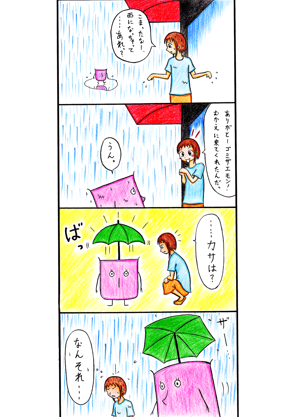 ゴミザエモン君は、ある事を知らなかったようです。 雨の日のおむかえというのは、相手の分のカサも持って行くということですね。ひみこちゃんが風邪をひいてしまうので、次回は忘れないようにしましょうね^_^; 今は車で迎えに来てもらうことがほとんどですが、どちらにしても雨の日のおむかえはうれしいものです。